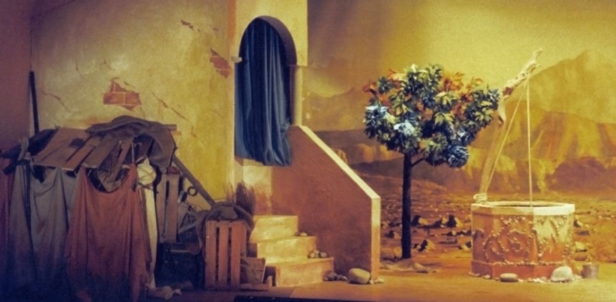 La construction s'est faite sur place avec l'aide des résidents en tenant compte des possibilités de chacun. Seule la toile peinte du cyclorama fût peinte à Genève dans les locaux de l'école. Comme l'essentiel des comédiens souffraient de handicaps altérant potentiellement l'équilibre, on m'avait encouragé à construire solide. En fait, je crois n'avoir rien construit de plus solide ensuite! On apprend. L'intrigue se déroule dans un petit village en bordure de désert. La petite scène de la fondation n'avait pas une profondeur gigantesque et nous sommes partis sur l'idée de la toile peinte pour ouvrir le décor au maximum.
